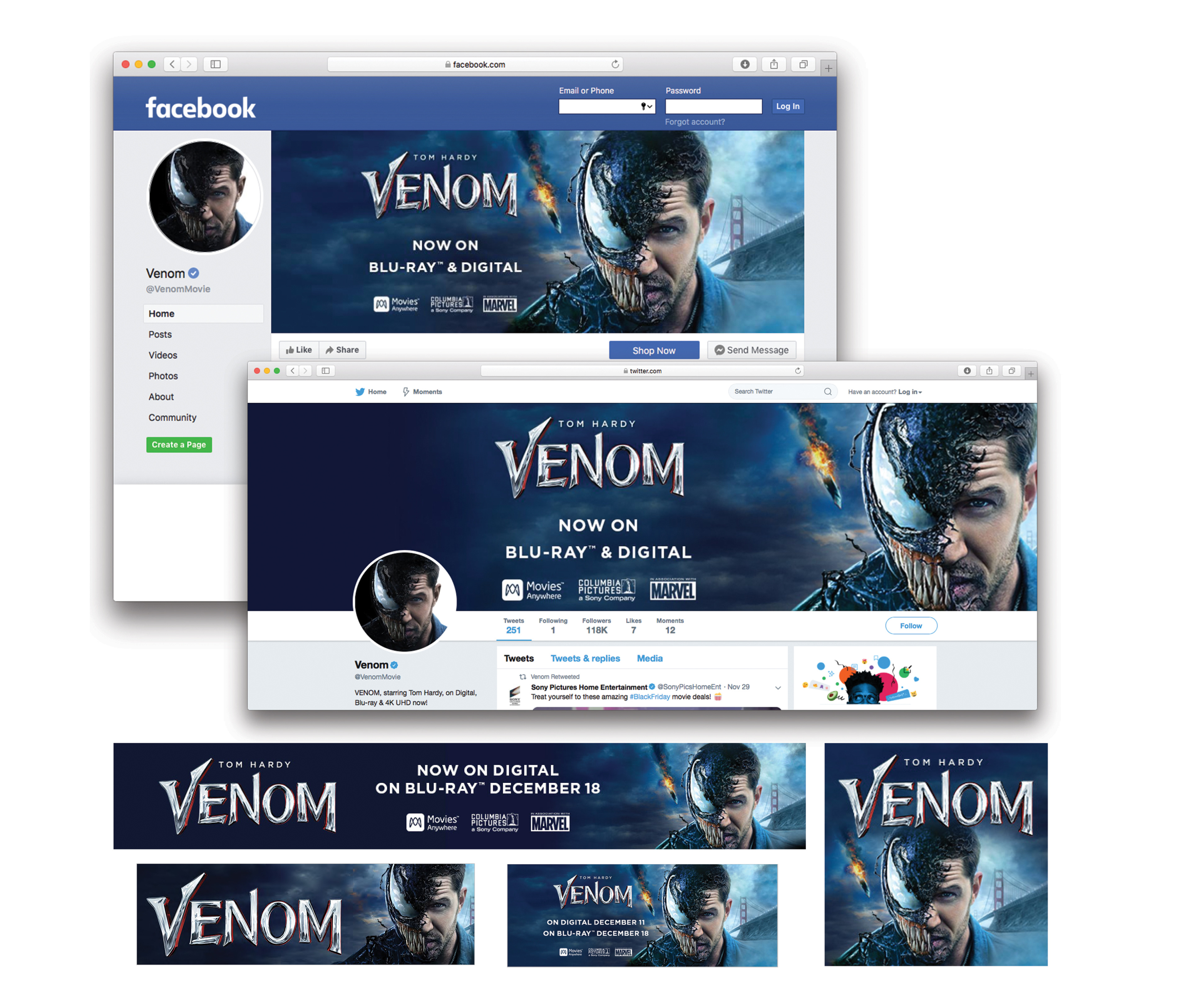 Venom ocial Assets, Blu-ray and DVD Packaging, Digital Assets, POP and Headers. Designed social media skins, interactive Keyart for iTunes and POP packaging and headers.