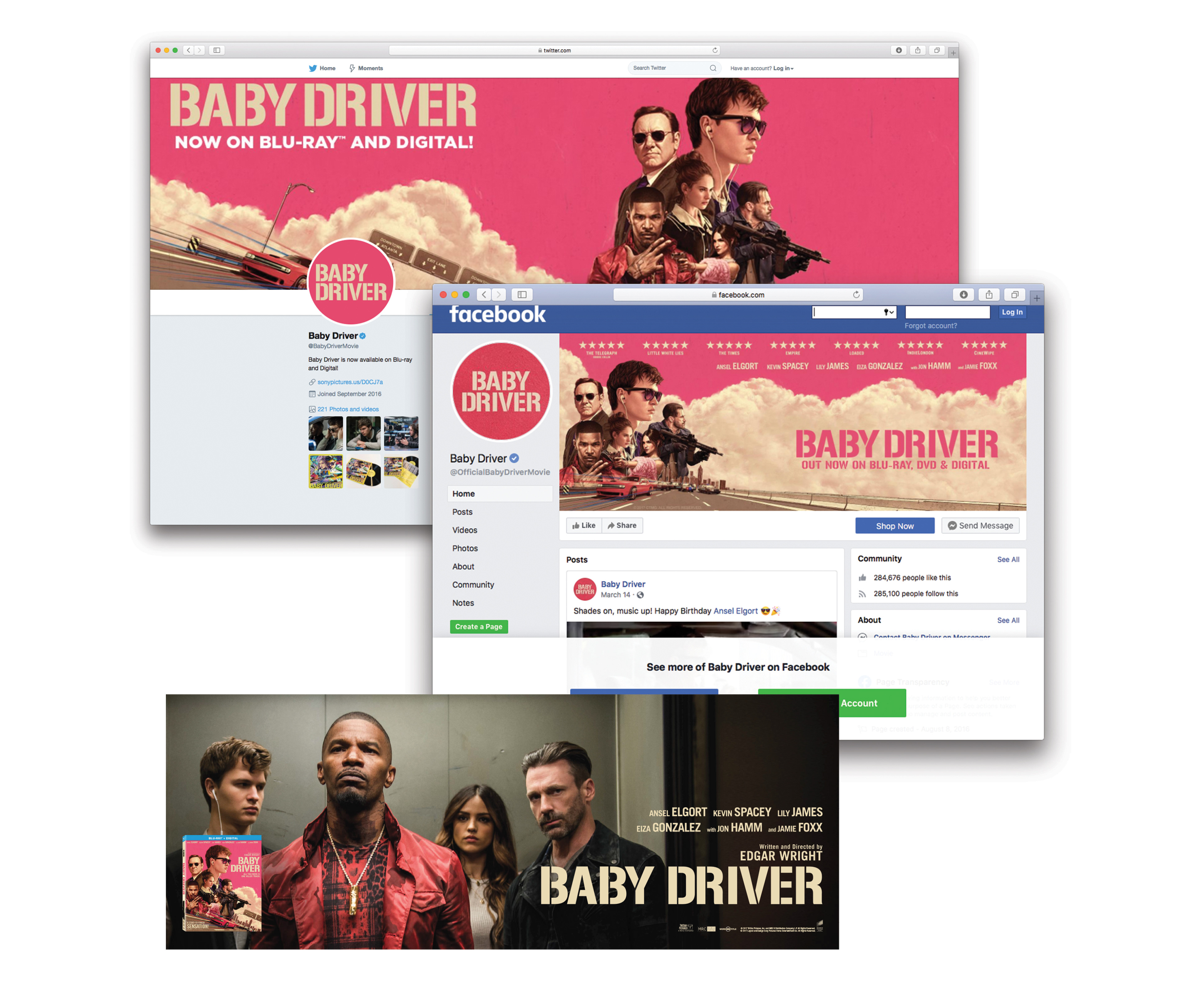 Baby Driver Social Assets, Blu-ray and DVD Packaging, Digital Assets, POP and Headers. Designed social media skins, interactive Keyart for iTunes and POP packaging and headers.